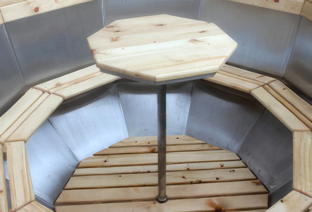 Банный чан с ветрозащитой изготовлен из пищевой стали. Представляет собой большую ёмкость в виде чаши, при нагревании которой можно париться на свежем воздухе. Банный чан установлен на металлическую закрытую подставку, которая служит защитой от ветра и печью одновременно. В комплект такой модели входит дымоход 2 метра. Чан оборудован кедровым бортом, скамейками, подспинниками, трапом для ног и приставной лестницей.