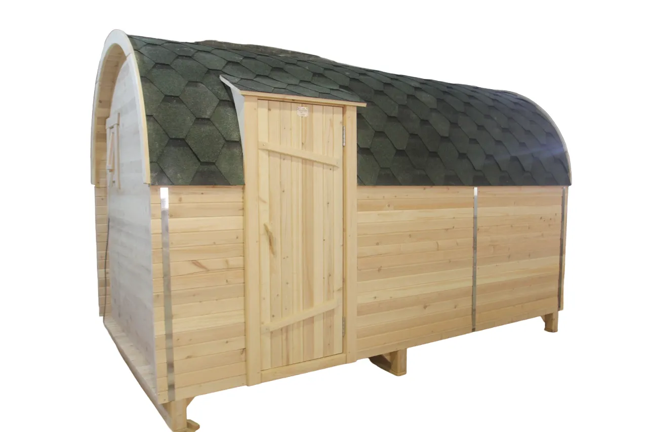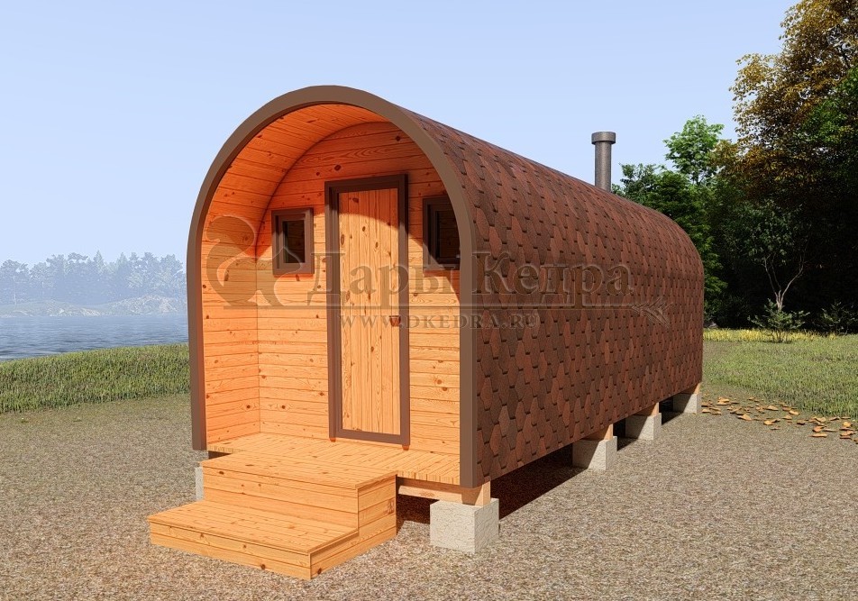 Главной отличительной особенностью данной бани «Буханка» является полная обшивка гибкой черепицей всей внешней части бани, а так же наличие крытой входной группы. Включает в себя небольшую веранду, раздевалку, которая служит комнатой отдыха, моечную и парильное отделение. Для удобства пользования в раздевалке находятся лавочки и вешалка из кедра. Моечная оборудована душевым поддоном, полочкой и лавочкой. В парильном отделении по обе стороны расположены двухуровневые открытые полки, печь установлена между ними у дальней стены. Время растопки такой бани не превышает 30 минут. По вашему желанию баню-бочку можно укомплектовать козырьком, верандой и печью с внешней загрузкой, благодаря которой весь мусор после топки остается на улице. Баня-бочка буханка не требует полноценный фундамент, поэтому при необходимости ее можно перенести в другое место.