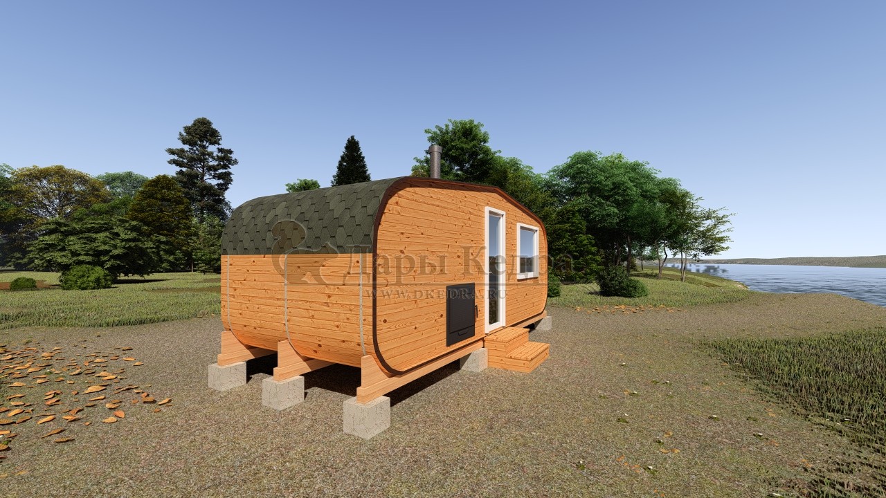 Овальная баня-бочка из кедра просторная и вместительная. Имеет два отделения: раздевалку, которую можно использовать как комнату отдыха, и парилку. Для удобства пользования раздевалка оснащена лавочкой, полкой и вешалкой из кедра. В парильном отделении располагается печь и двухуровневый открытый полок. Для установки такой модели не требуется полноценный фундамент, поэтому при необходимости ее можно перенести на другое место. Так же баню-бочку можно укомплектовать верандой со скамейками, козырьком и печью с внешней загрузкой, благодаря которой весь мусор после топки останется на улице.