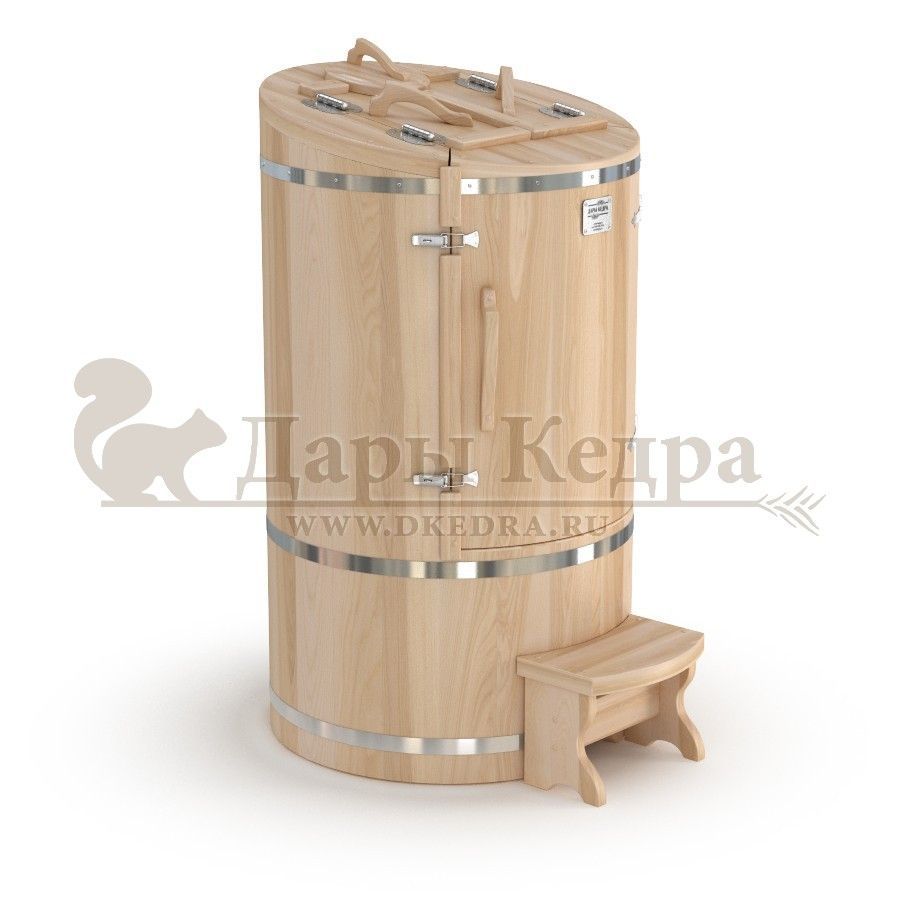 Круглая фитобочка из кедра - это мини парная, которую можно использовать не только в спа-салонах, но и дома. Такая модель наиболее компактна и мобильна. Толщина стенок составляет 40-45 мм, что позволяет увеличить срок службы изделия. Фитобочка оборудована откидными створками, дверцей и отверстием для головы. Верхний скос изделия делает положение головы более комфортным и улучшает обзор. Во время парения человек сидит внутри кедровой бочки, а голова находится снаружи. Благодаря этому исключается возможность перегрева. Подлокотники из кедра, встроенные ручки на створках и двери делают эксплуатацию более удобной.