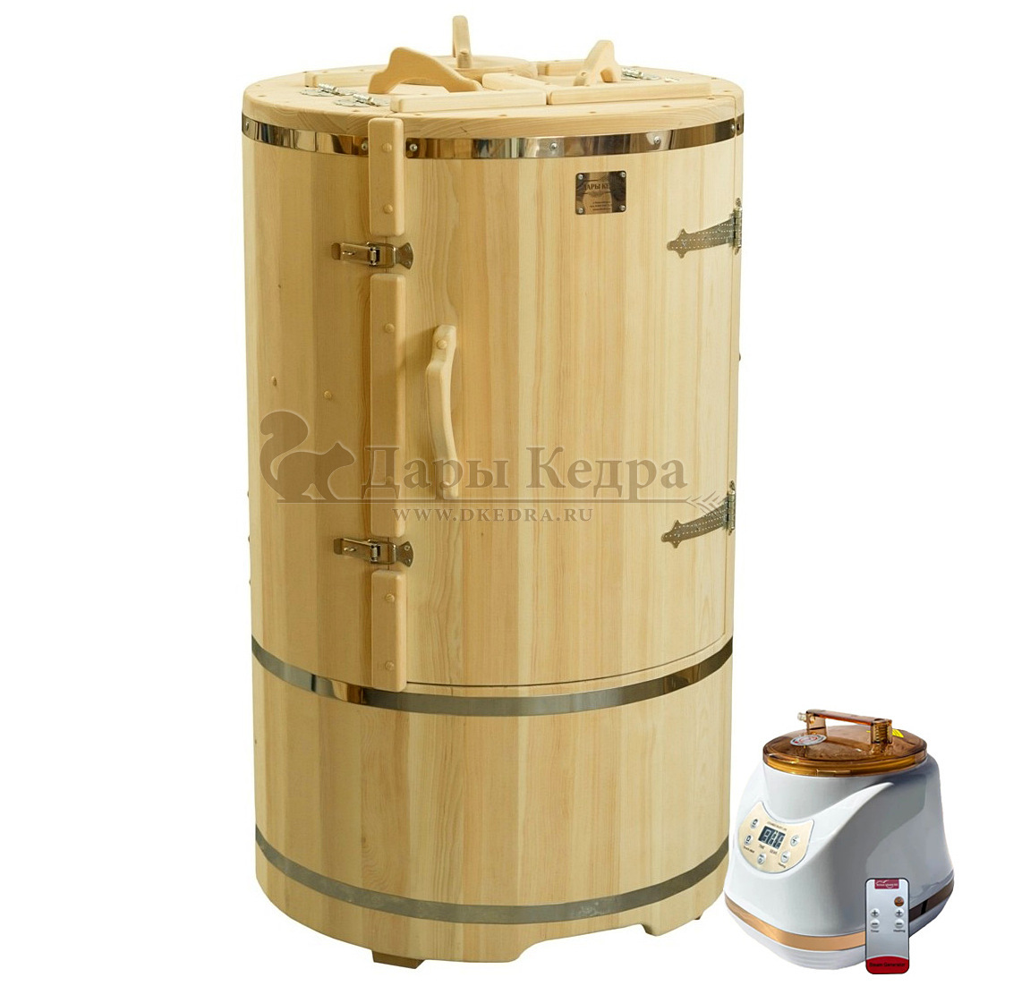 Готовый комплект включает в себя: круглую классическую фитобочку + накопительный парогенератор мощностью 1,5 кВт с аромоёмкостью и пультом управления, детский уровень сидений, поддон для сбора конденсата, фитосборы.